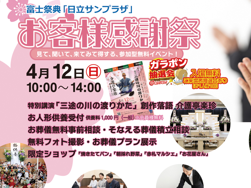 日立地区の総合葬儀式場の日立サンプラザでは、4月12日に「春のお客様感謝祭」と題し施設見学会やお葬儀事前相談会を開催します。今回は特別企画として創作落語「三途の川の渡りかた」があり現役ケアマネージャー...