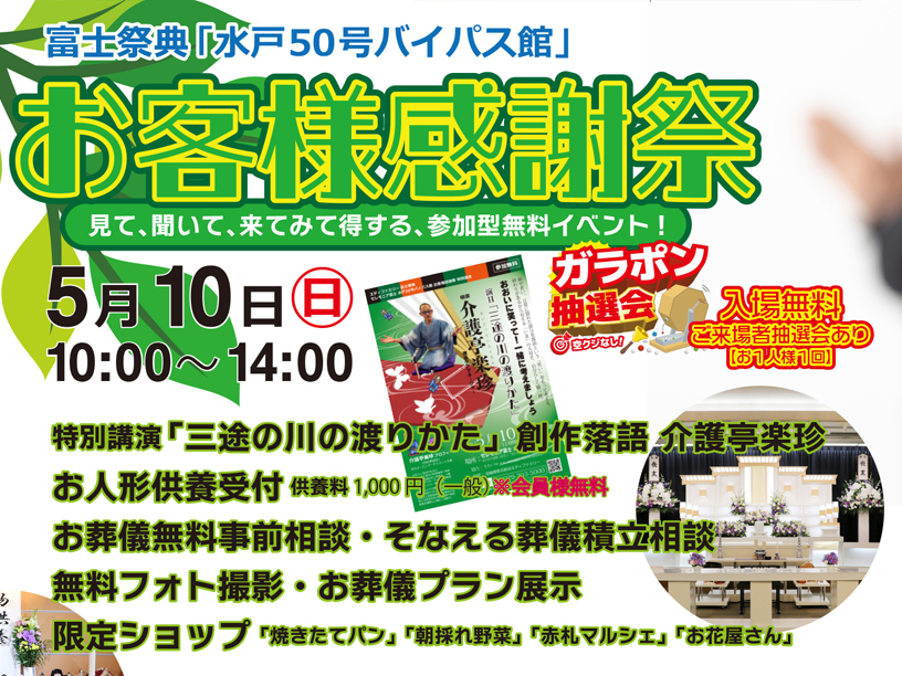 水戸地区の総合葬儀式場の水戸50号バイパス館では、GWの5月10日に「お客様感謝祭」と題し施設見学会やお葬儀事前相談会を開催します。今回は特別企画として創作落語「三途の川の渡りかた」11時~があり現役...